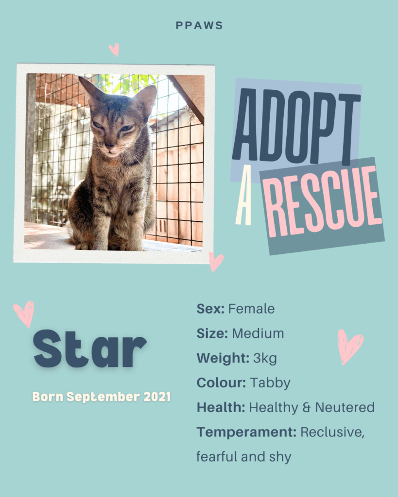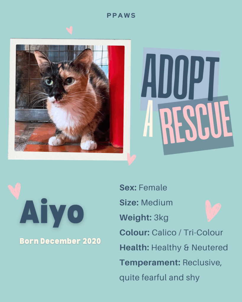 Aiyo is one of our more shy and reserved residents, but she is warming up to people. She is still young, and with the love and care of a patient and kind adoptive home, we are sure she will open up and become a loving cat friend. She just needs to be given a chance!