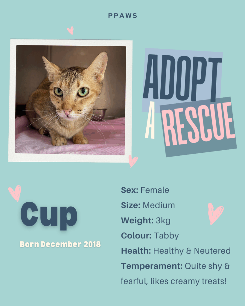 Cup is one of our more reclusive residents. She is cautious and fearful from some scary early life experiences, but she has slowly opened up to our team. We hope she will meet a kind, patient person who will love her and take her home for her next chapter.