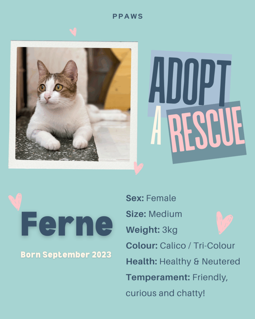 Ferne is a super-friendly girl who was rescued from a pagoda after other cats around her were killed by dogs. She is sweet, confident and chatty and loves cuddles and affection. You can meet Ferne at our partner rescue cat cafe Ministry of Cat, and see if she is the one for you!