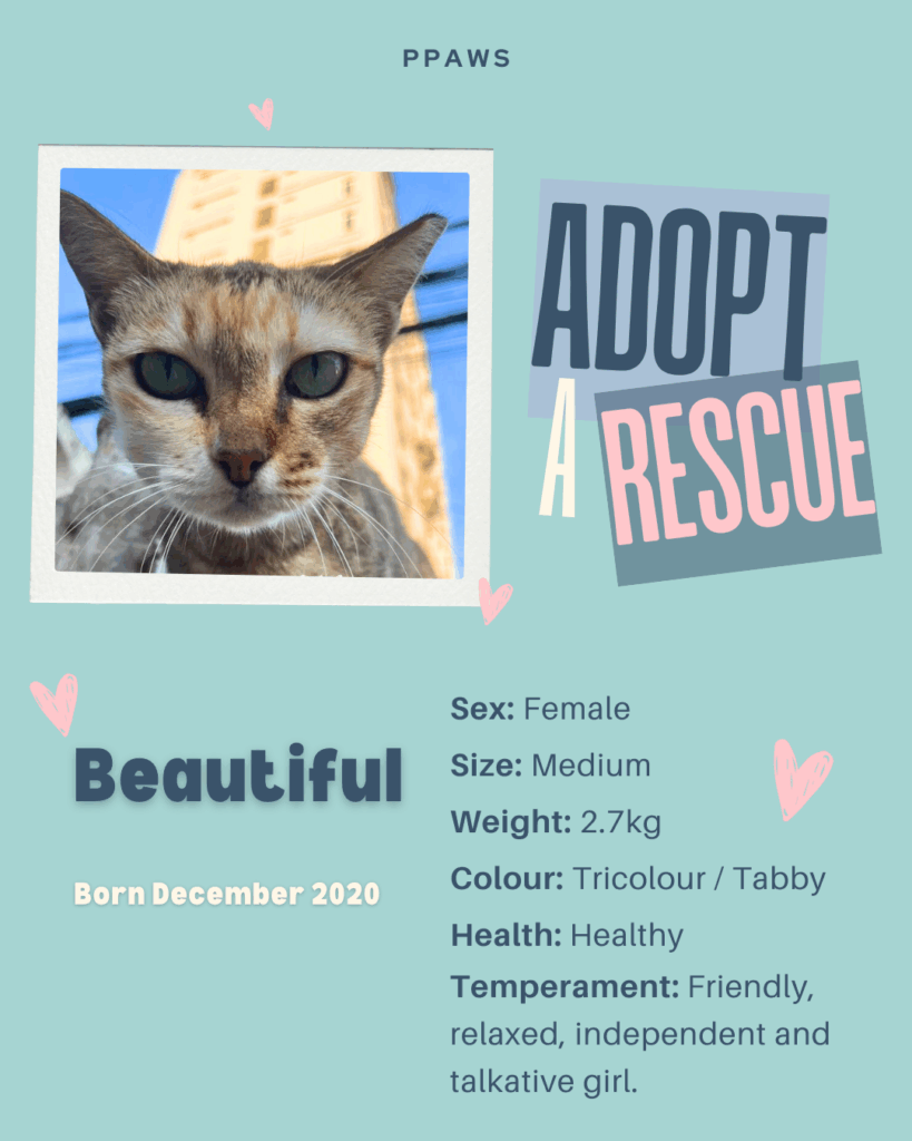 ‘Mrs Beautiful Face’ was rescued from a pagoda after being stuck inside a stupa for a week. She is friendly, laid back, independent and relaxed. She is currently living at Ministry of Cat, waiting for her forever home!
