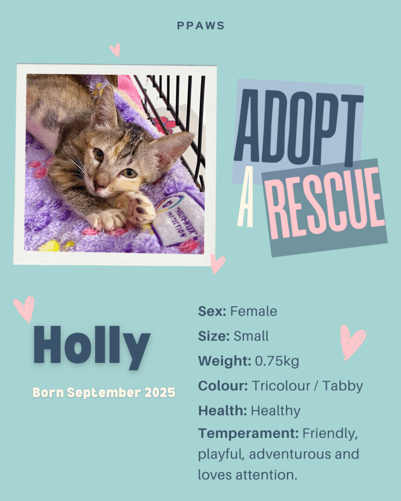 Maple was rescued on one of our missions, after escaping from a dangerous environment. Maple is receiving treatment for FIP, but is playful and friendly and doesn’t appear unwell. She would do really well in an adoptive or foster home with someone who can give her daily medicine, with support from PPAWS.