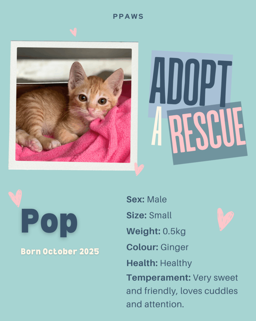 Pop was brought to PPAWS by a kind person who saved him from being hit by a tuktuk. This young kitten is very friendly and would love to go to his forever home soon.