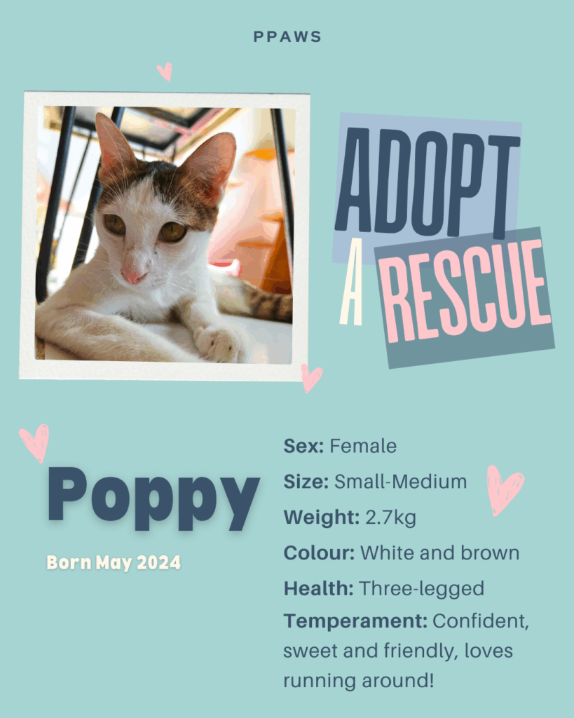 Poppy came to PPAWS after a terrible accident, needing one of her back legs and part of her tail amputated. Poppy has had a long but successful recovery and is very used to life on three legs. She is very friendly and super playful and active, she is just patiently waiting for her forever home.